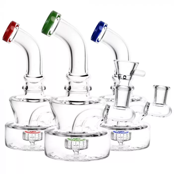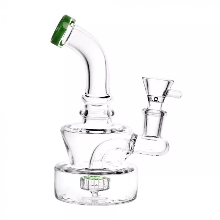 Diese attraktive Mini-Bong aus klarem Glas mit farblich abgestimmten Akzenten am zurückgesetzten Mundstück und oben am Perkolator eignet sich perfekt für den Gebrauch zu Hause oder auf Reisen. Diese Wasserpfeife hat einen dicken, schweren Boden, der toll aussieht und für felsenfeste Stabilität sorgt, sodass sie beim Befüllen des Kopfes nicht wackelt und umkippt.